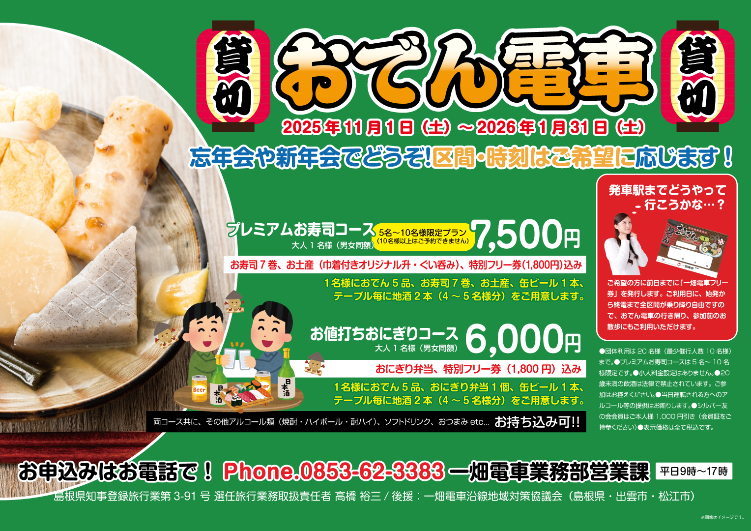 おでん電車の利用者には、「おでん電車」フリー券を発行します(発行当日の定期列車にも乗車できます)