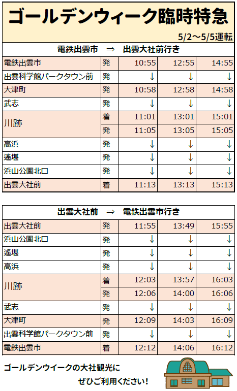 ゴールデンウィーク期間中の大社方面の観光に、ぜひご利用ください。