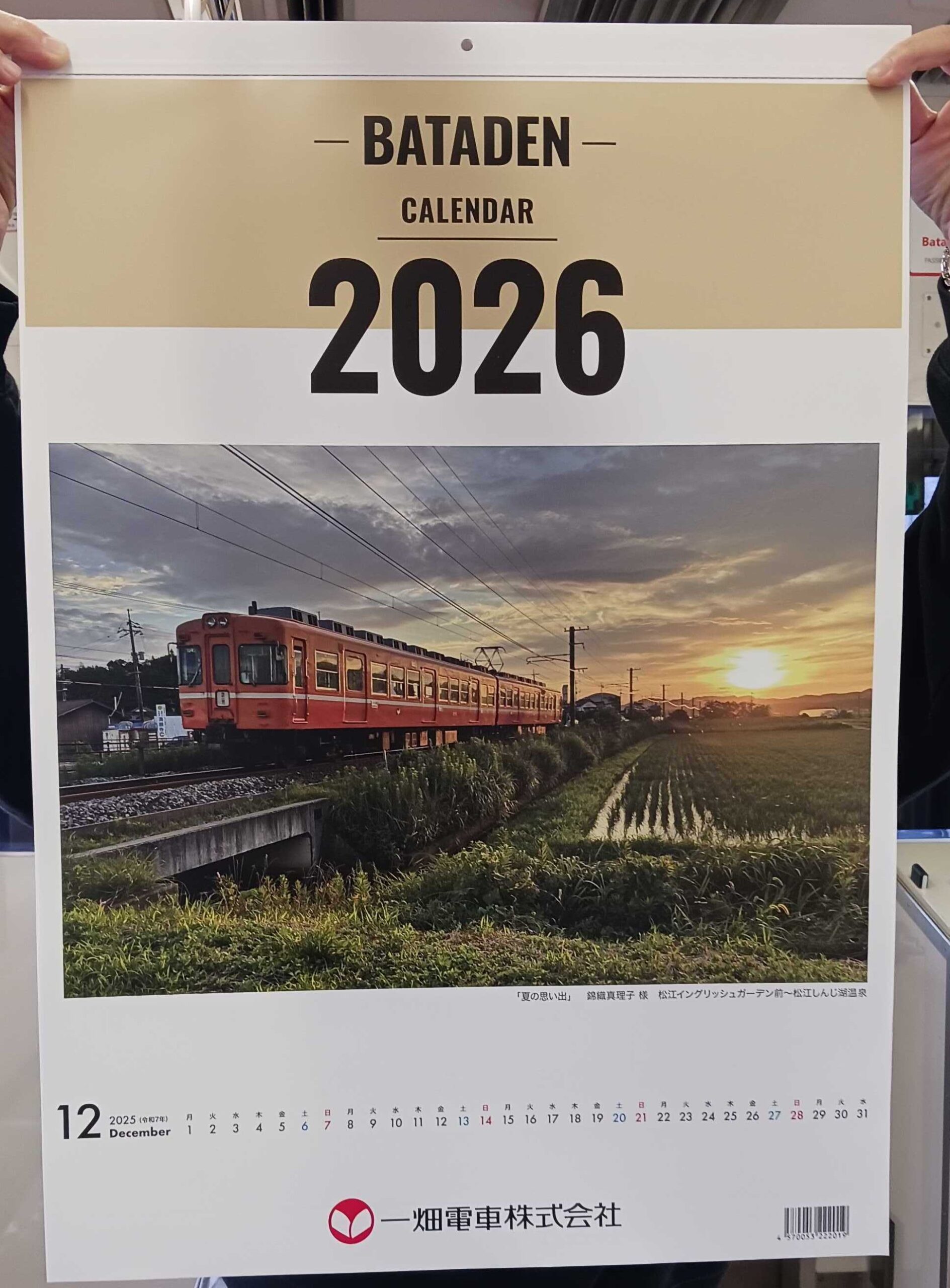 「ばたでんのある風景」をテーマに写真を募集した「2026一畑電車カレンダー」が完成し、本日駅サイトまつりをはじめ、Yショップ松江しんじ湖温泉駅店、雲州平田駅、出雲大社前駅売店、電鉄出雲市駅にて販売します。