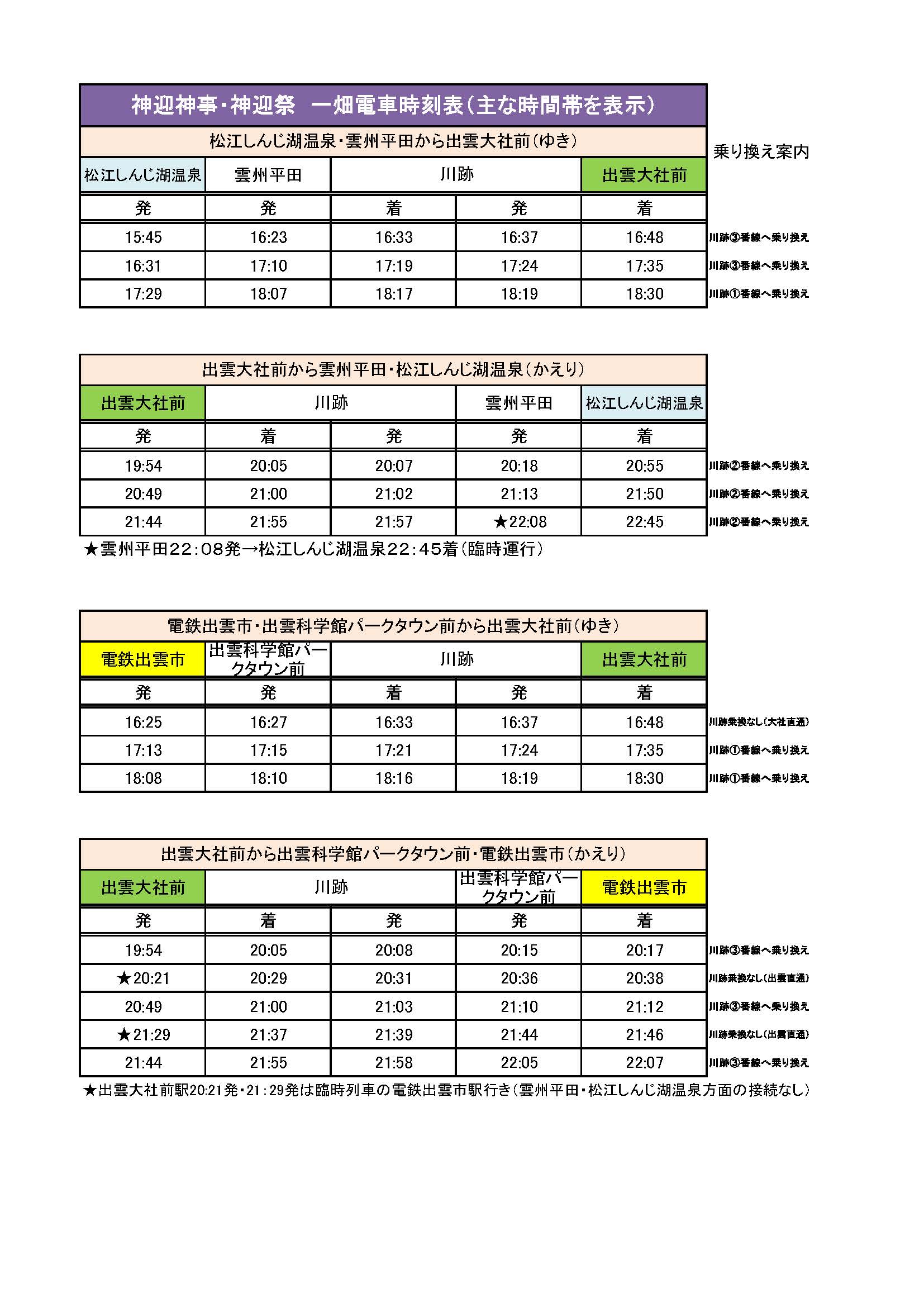 なお、神在祭(11月29日(土)~12月6日(土))の期間中は、大社線(出雲大社前~川跡)を中心に大変な混雑が予想されますのでご了承ください。